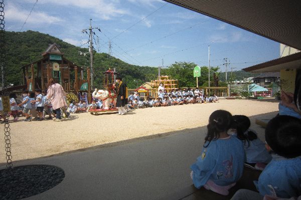 今日は、お釈迦様の誕生をお祝いする花まつりがありました。朝から、「しろいぞうさんがくるね!」「おしゃかさままだこないの?」と、楽しみにしていました。年長組さんがお寺からしろいぞうにのせた花御堂の中にのられているおしゃかさまを連れて来てくれました。