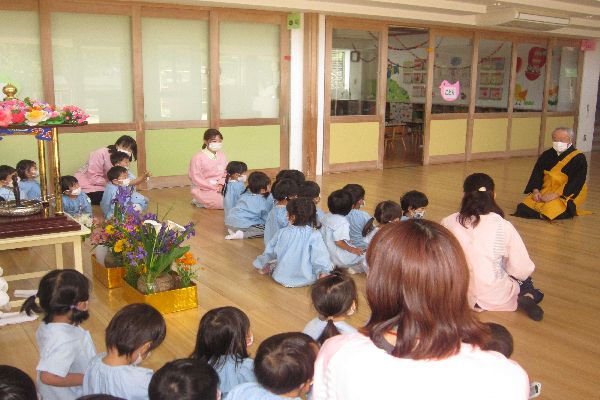 おしゃかさまをお迎えした後、1階のホールに集まって、花まつりのお祝いをしました。園長先生から、「みんなにもお誕生日があるね!おしゃかさまの誕生日は、ろうそくやケーキでお祝いするのではなく、甘い甘茶をかけてお祝いしようね!と、お話してもらいました。