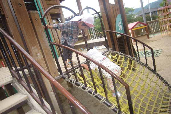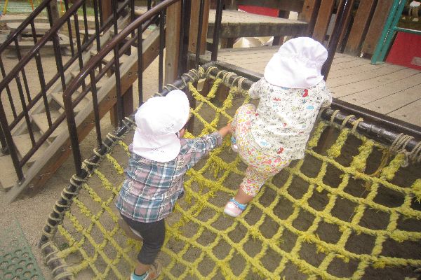 「いらっしゃいませ~!おいしいですよ~」ハウスが、お店屋さんになっていました♪総合遊具の「あみあみ」と、こどもたちが読んでいる所も、登れるようになりました。お友達同士「がんばってー」と、応援してあげていました。