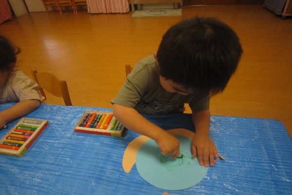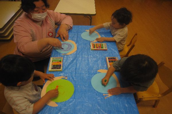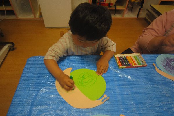 今日は、みんなでかたつむりを作りました。かたつむりの殻にクレパスで模様を描いたよ!「ぐるぐる~たのしいね!」素敵なかたつむりが出来ました!