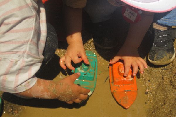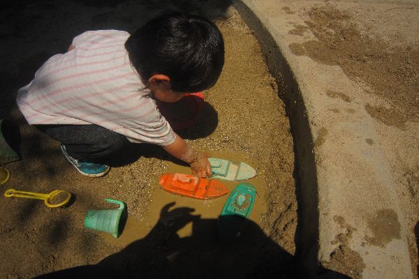 さつまいもを植えた後は、外でいっぱい遊びます♪水をじょうろに入れて、砂場に運んでいきます。お池をつくって、ふねを浮かべました♪