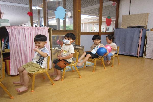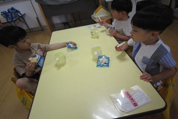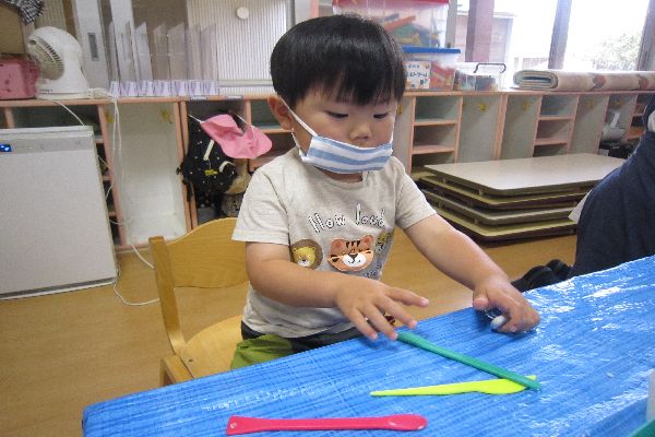 いちご組さんと一緒に遊びました。粘土・お絵描き・おもちゃとそれぞれ好きな遊びを楽しみました。おやつを食べた後は、ボールで遊んだり、園庭で滑り台や砂遊びをしました。