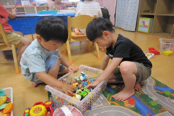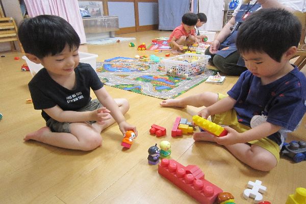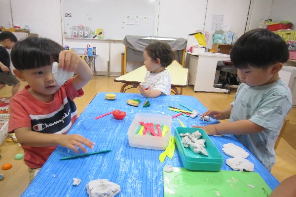 今日はいちご組さんと一緒に遊びました。ポケモンの指人形や粘土など、思い思いの遊びを見つけて元気に遊びました。