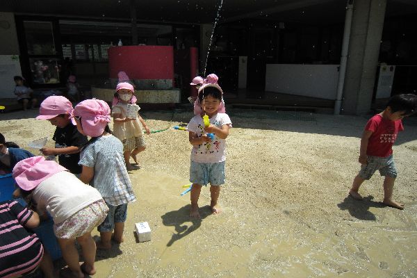 牛乳パックのコップを使って水遊びをしたり、水鉄砲も上手に使ってみんなとっても楽しく遊びました。