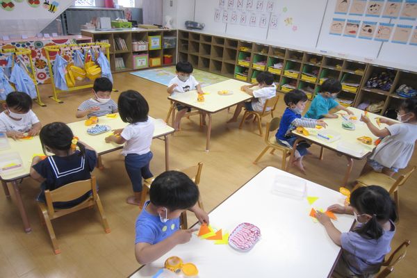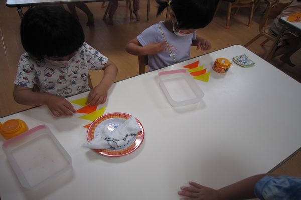 今日はさんかくつなぎを作りました。黄色いさんかくとオレンジさんかくを交代で「オレンジ、きいろ、オレンジ、きいろ…」と言いながら順番に糊付けしてきれいなさんかくつなぎが完成しました!