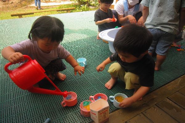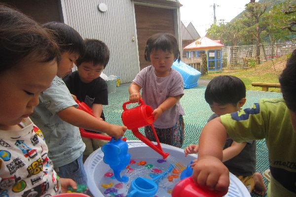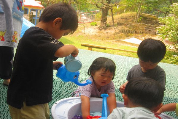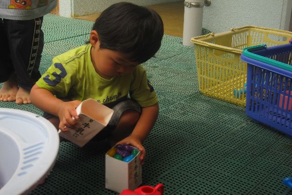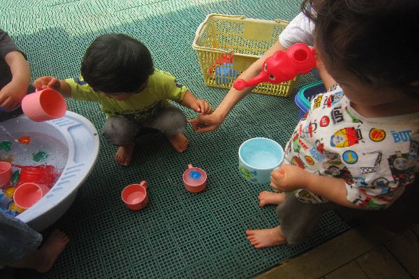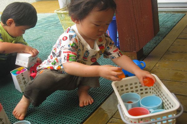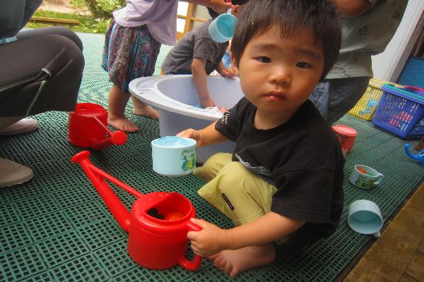 今日は、楽しみにしていた水遊びの日!着替えを持ってきたいちご組さん!早く水遊びをしたくてたまらない様子です♪水を入れたたらいや、おもちゃを見て、更にうきうきしたようです♪
