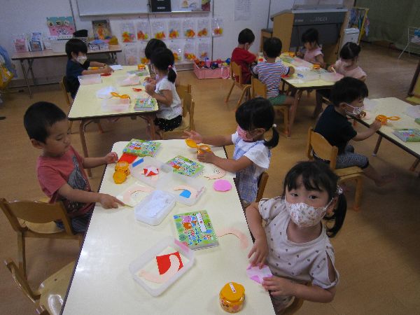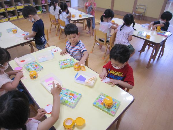 折り紙を折ったり、マーカーを使ってかたつむりの顔や模様を描きました。「ハートのかたつむりさんにする!」「ぼくはぐるぐるの模様だよ!」と自分だけの素敵なかたつむりを製作することができました♪