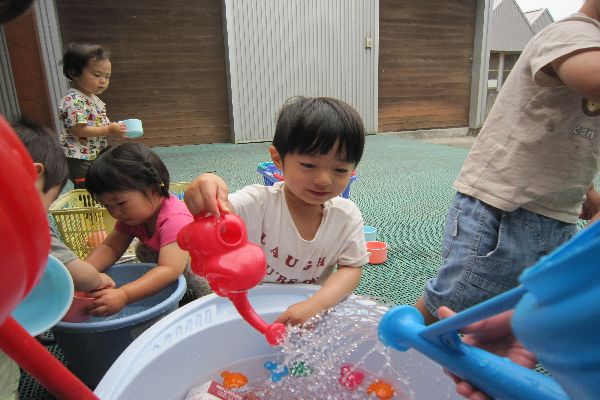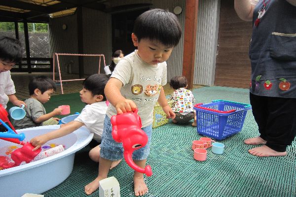 今日も水遊びをしました。足や手に水がかかると、「つめた~い!」と言いながら楽しんでいました。