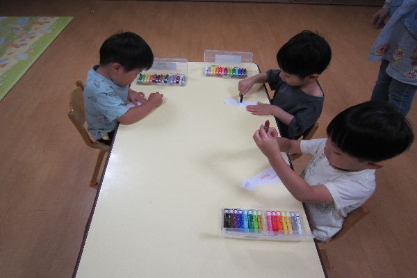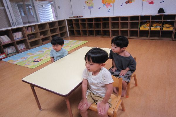 水遊びの後は、お父さんのプレゼントを作りました。上手に「手はおひざ」でお話を聞いています。