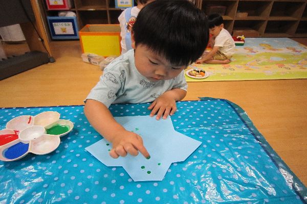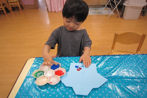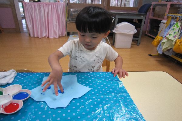 その後、シャツに絵の具で、トントントンと模様を付けました。今週の金曜日にお母さんのプレゼントと一緒に持って帰ります。受け取ってあげてください。