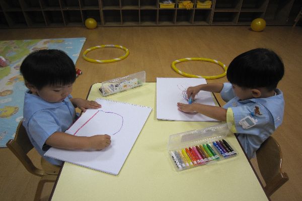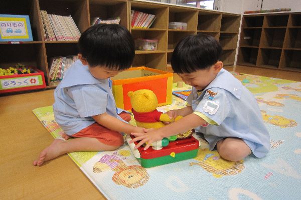 今日も雨だったので、お部屋の中で遊びました。午前中はいちご組さんと一緒に、ブロックや車のおもちゃなど、好きな遊びを楽しみました。その後、絵本を借りて、初めて身体測定をしました。かっこよく気を付けをして、測定できました。