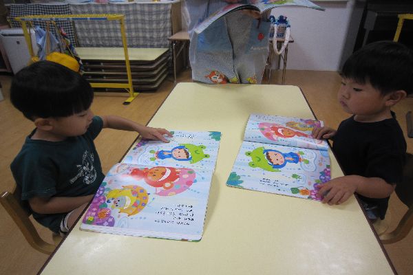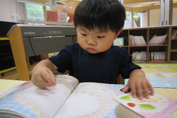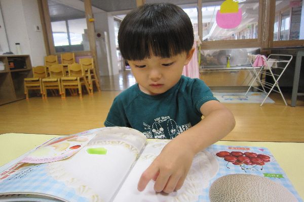 月刊絵本の6月号を見ました。自分の絵本を1ページずつめくりながら見ました。シールのページでは、ケーキにくだもののシールを貼って、おいしいケーキを完成させました。歌のページでは、かたつむりの歌だったので、手でかたつむりを作って歌いました。毎月読んでいきます。7月号はどんなお話か楽しみだね!