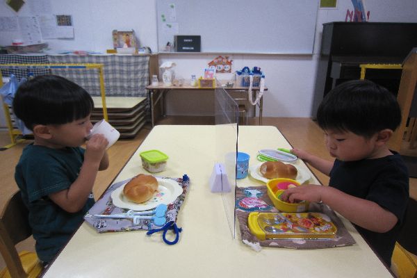 今日のお弁当は初めてのパンと牛乳でした。「ふわふわ~!」「おいしい!」と言いながら、大きなお口でもぐもぐ食べていました。明日は給食弁当です♪