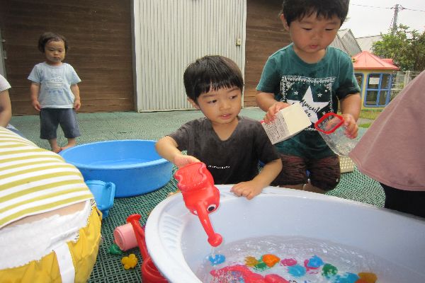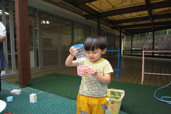 いちご組さんと水遊びを楽しみました。だんだん遊び方がダイナミックになってきて、頭にかかっても平気で思いっきり楽しみました。