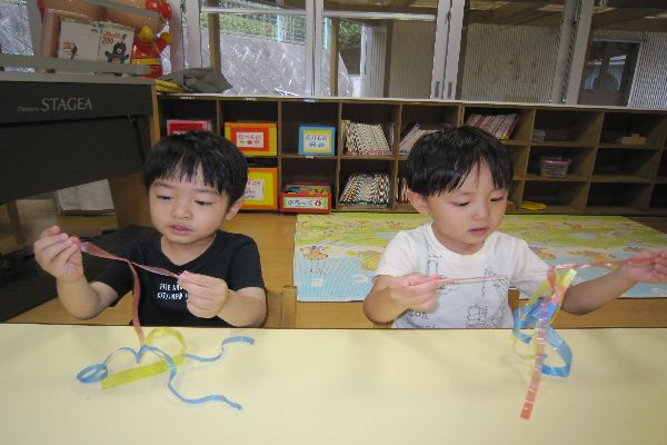 水遊びの後、七夕飾りの流れ星を作りました。すずらんテープをさいて、星にひらひらをつけました。