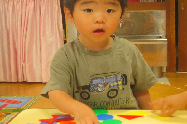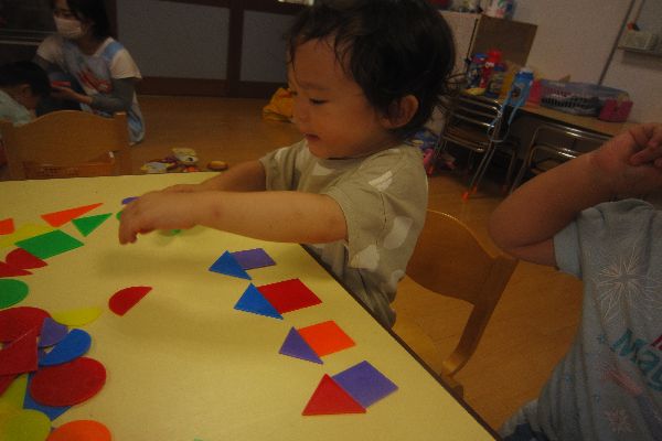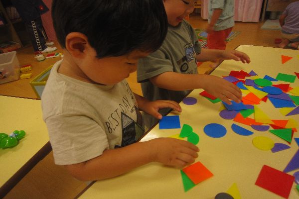 いちご組さん、今日も元気に登園してきました♪お部屋で、ひよこ組さんと一緒に遊びました!色板カードで、いろんなものを作って、楽しく過ごしました。ロボットや、車、お家など、上手に組み合わせていました。