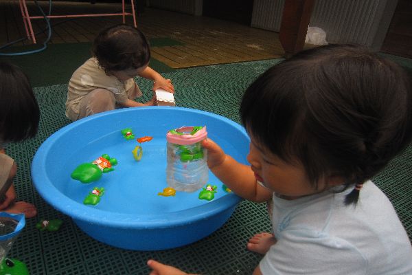 たのしかったね!おへやで遊んだ後は、水遊び!!今日は、カエルさんが仲間入り♪みんなお気に入りです!