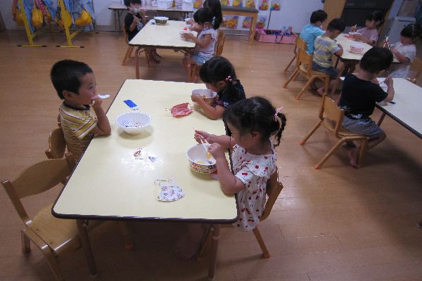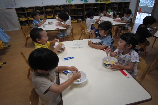 おいしいおそばができたらお箸を貰っておそばをみんなでいただきます!「おいし~ね」と言いながらみんな自分で作ったおそばを喜んで食べました!
