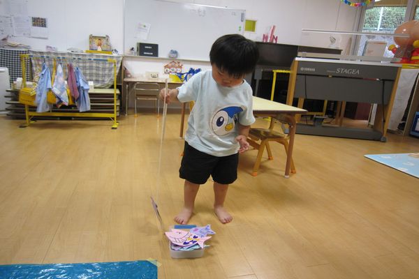 青いシートの上にたくさんお魚を泳がせて、魚釣りをしました。はじめは、なかなかねらったところに磁石が届かず苦戦していましたが、だんだん上手になり、たくさん釣れて楽しんでいました。「やったー!つれた!」と喜んでいました。