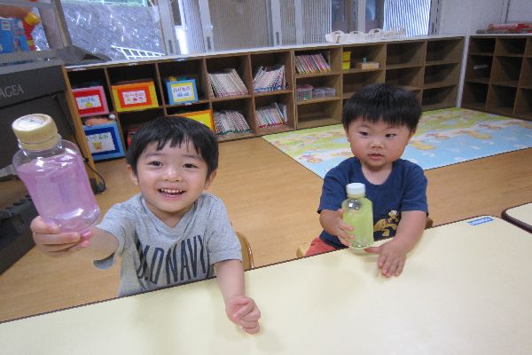 色水をジュースに見立てて、ジュース屋さんごっこをしました。透明の水が入っているペットボトルを振ると、「わあ~!ジュースになった!」と大喜び。「イチゴジュースだ!」「ぶどうジュースだ!」といろんな味のジュースができました。自分の好きな味のジュースをついでもらったり、お友だちについであげたりしました。最後に、いろんな味を混ぜて、どんどん色が変わっていき、ミックスジュースができました。