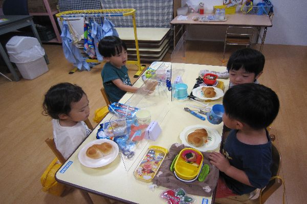 たくさん遊んだ後は、お弁当。パンもパクパク食べて、牛乳も冷たくておいしかったね♪