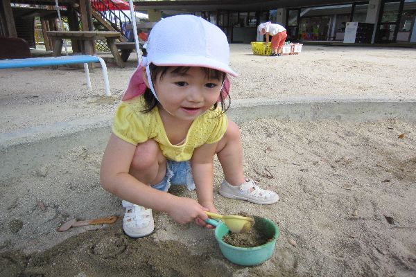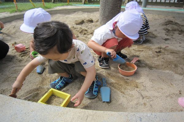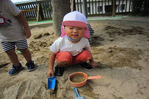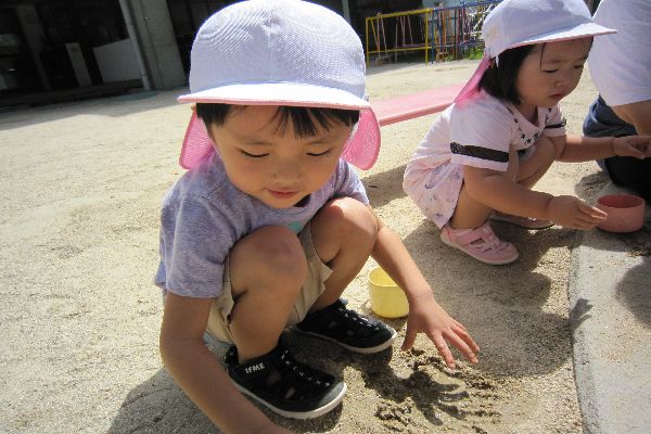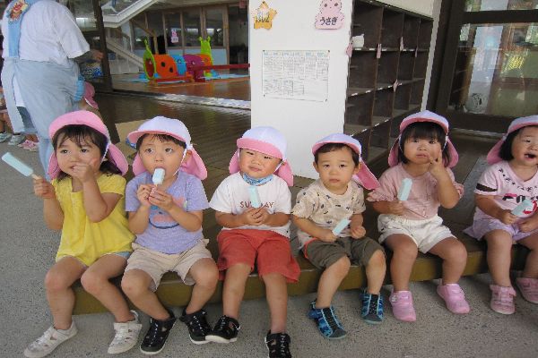 今日はいちご組さんと一緒に遊びました。アイスを食べて、園庭で砂遊びやすべり台をして遊びました。