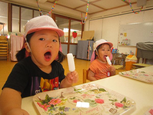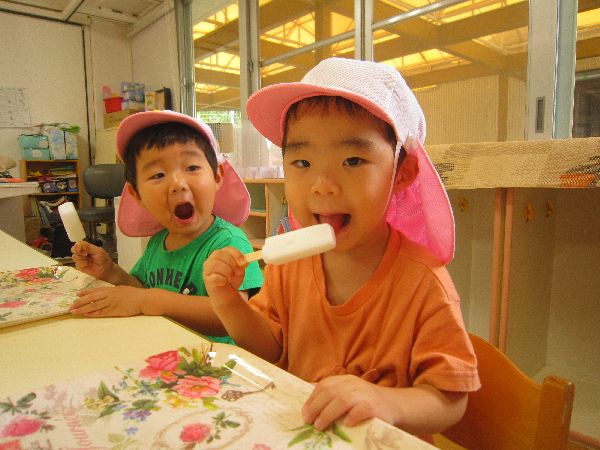 たくさん遊んだ後は、おいしいあアイスクリームです!冷たくて、おいしいよ!