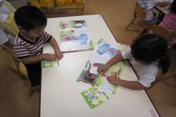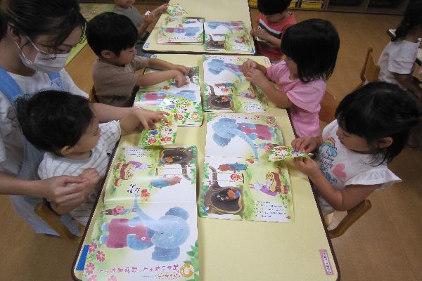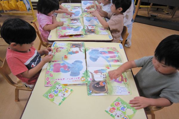 今日は月刊絵本の9月号を見ました。お月見のお話や秋の虫、自分でお着替えをするお話など、自分でページをめくりながらみんなで見ました。シールのページでは、動物さんのシールを楽しんで貼っていました。