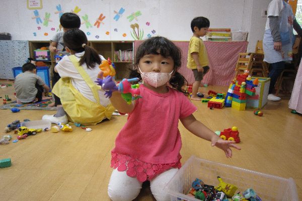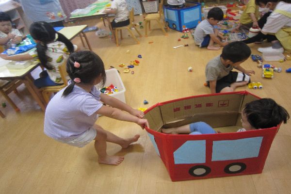 今日はいちご組さんと仲良く遊びました。粘土や乗り物、ブロックなど、楽しそうに遊んでいました。段ボールで作った車に乗って、引っ張ってあげていました。