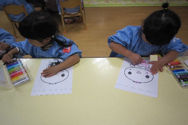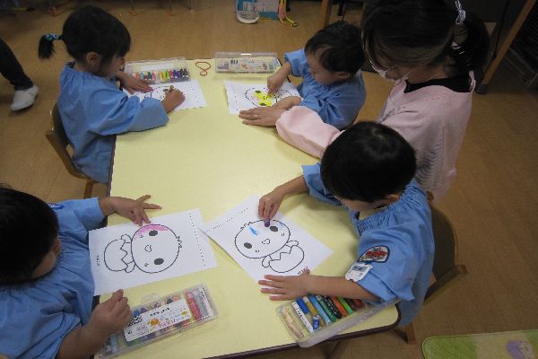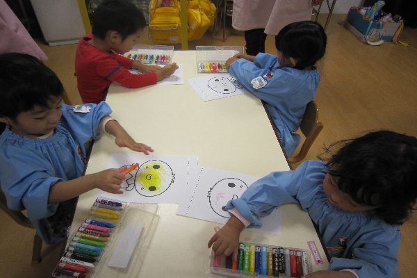 今日は、ひよこさんに好きな色を塗って、かわいいひよこさんに変身させてあげました。クレパスを使って、白い所が無くなるようにゴシゴシ塗りました。