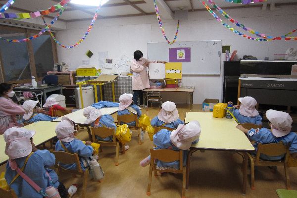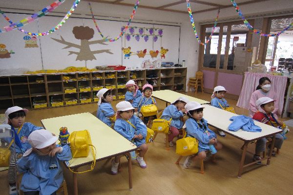 お帰りの時に、大型絵本を見ました。いろんなたまごから赤ちゃんが出てくるお話で、みんなで「でておいで~!」と呼びながら見ました。「また見たーい!」と、楽しかったようです。