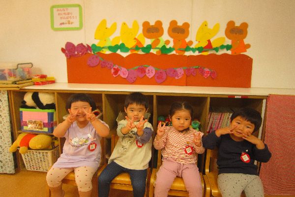 いちご組さん、今日も元気いっぱいです♪この間みんなで絵の具でペタペタしたおいもの壁面が完成しました。みんなで、壁面の前で「はい!ぽーず!」