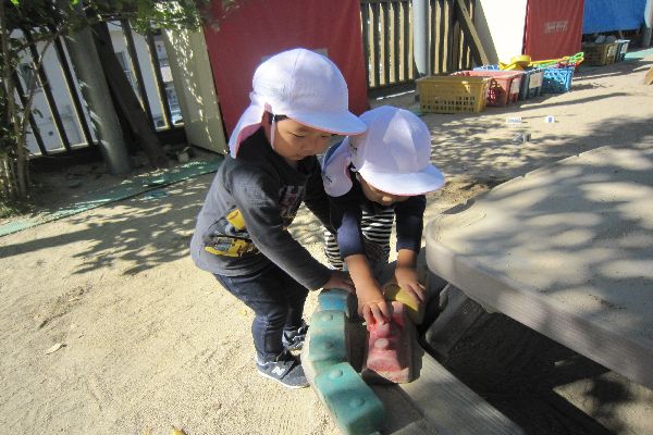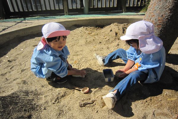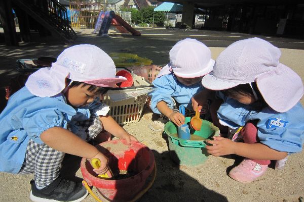 今日も元気いっぱいのひよこ組さん。「お外に行くよ!」と言うと、「やったー!」と大喜びです。バケツに水を入れては運び、その中に砂を入れて、混ぜ混ぜ。コーヒーやカレー、いろんなごちそうを作っては食べさせてくれました。泥遊びが大すきです。