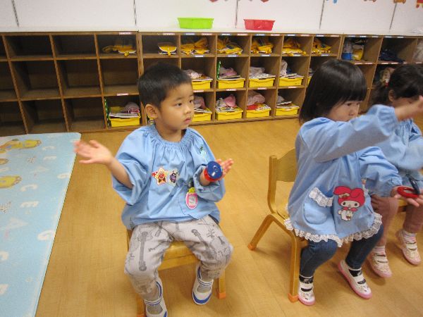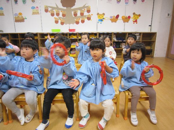 今日は、タンブリンとカスタネットで遊びました。果物の名前や動物の名前をみんなで叩いてみました。「りんご」「みかん」「うさぎ」など、みんなで声に出して言いながら叩きました。みんなで合わせて上手に叩いていました。最後に「♪さんぽ」の歌に合わせて、歌いながら叩きました。楽しかったね♪