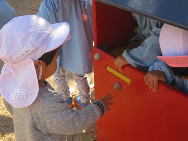 いちご組さん、ひよこ組さんと一緒に、初めて、下の園庭で遊びました。ハウスや、ゆらゆらかめさんなど、みんなで遊んでみました。