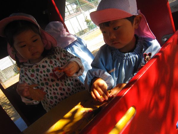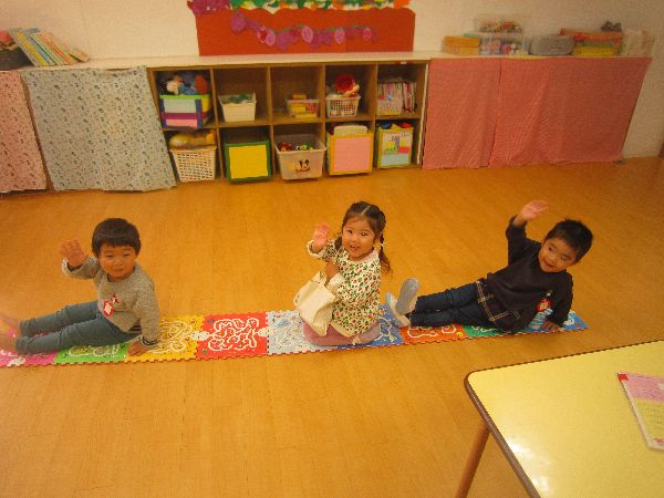 たくさん遊んだ後は、お部屋に帰っておいしいおやつを食べました。新入園のひよこ組のお友達と、一緒に食べました。その後、お部屋でマットをつなげて遊びました。電車に見立てて遊びましたよ!