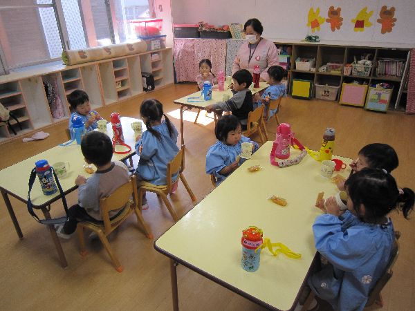 11月入園のお友達は、いちご組さんとおやつを食べました。}