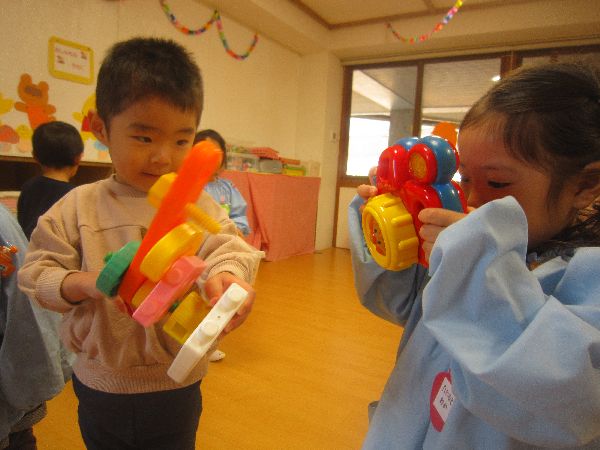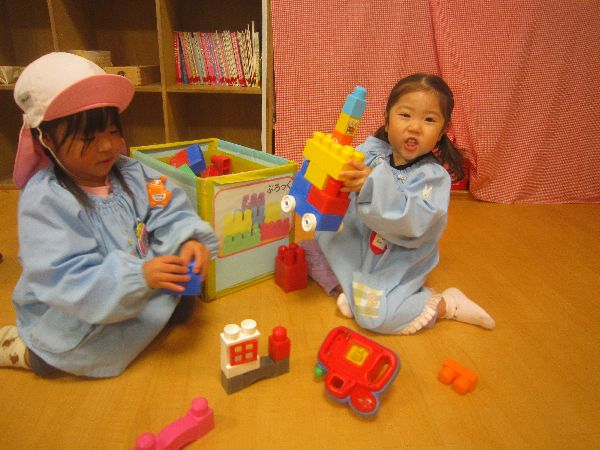 いちご組さん、今日も元気いっぱいです!ひよこ組さんと、一緒にブロックで遊びました!かっこいいのを、つくるよー!