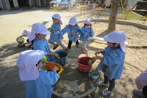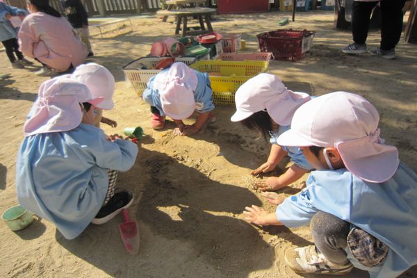 今日もお外でたくさん遊びました。泥遊びが大好きで、服が泥んこになるのも気づかず、夢中で遊んでいました。お団子やトロトロを作っては「先生、食べて!」と持ってきてくれます。「おいしい!」と言うと、嬉しそうにまた次を作りに行っていました。