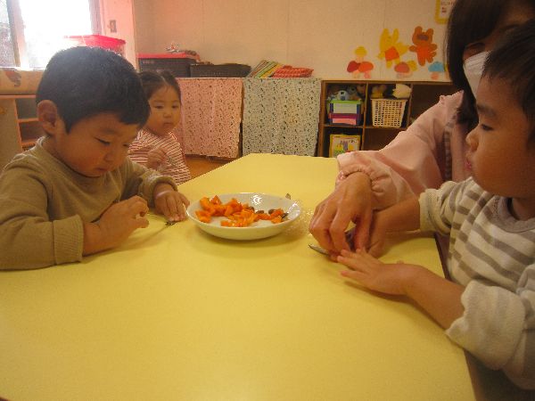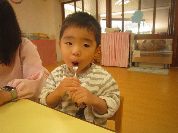 いちご組さん、今日も元気いっぱいです!おやつの後、お寺でとれた柿をみんなでいただきました!「あまーい」「おいしいね!」と大喜びでした!