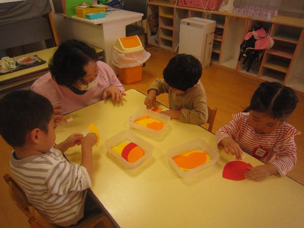 おいしいおやつのあとで、みんなでスタンプ遊びをしました。きれいなはっぱに、ぽんぽん!とスタンプを押して楽しみました!遊ぶ前に、先生のお話をみんなで聞いています。