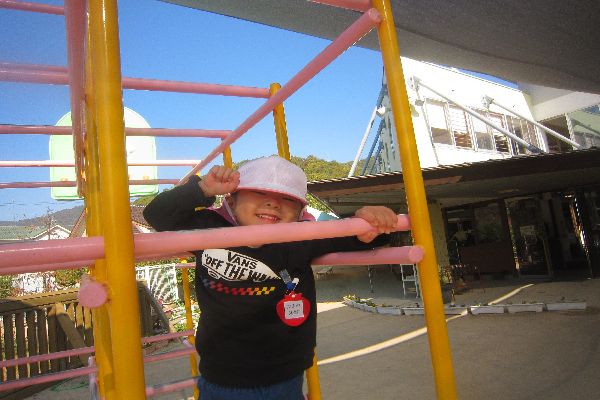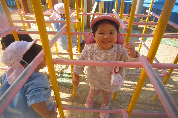 いちご組さん、今日も元気に登園してきました!すべり台や、ジャングルジムでも、上手に遊んでいます。