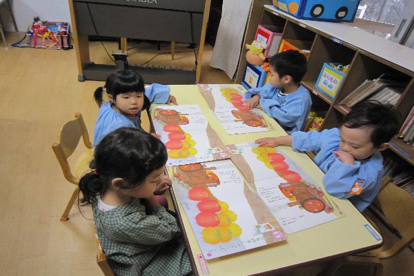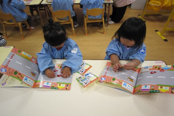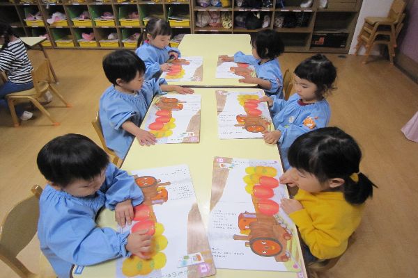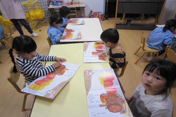 今日は月刊絵本の11月号を見ました。自分でページをめくって、真ん中を「ぎゅっぎゅっ」と手で押さえて広げながら見ました。くだものきしゃぽっぽのお話しや、「やきいもグーチーパー」の歌、お弁当を食べるときの姿勢など、楽しんで見ていました。シールのページでは、はたらくくるまのシールを道路に貼りました。月末にお家に持ち帰るので、また、一緒に見てあげてください。