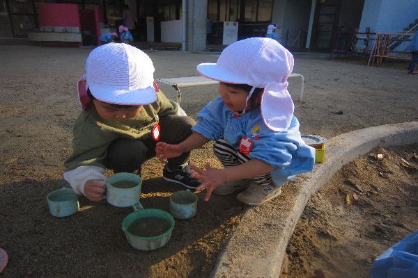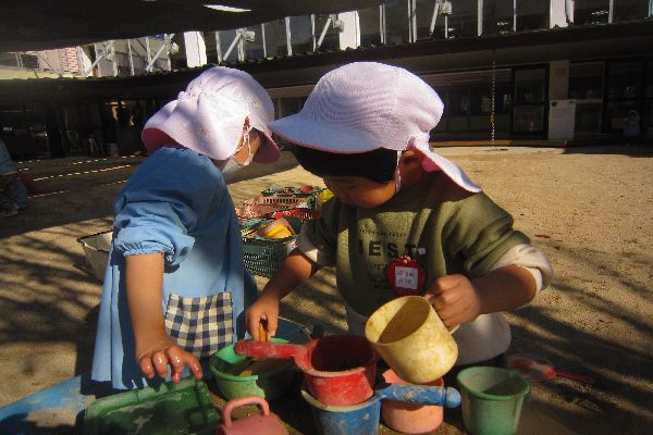 お料理を作っているお友達とも、一緒にあそびました。おなべにスープを入れたり、葉っぱでポテトチップスを作りました♪