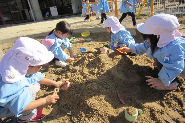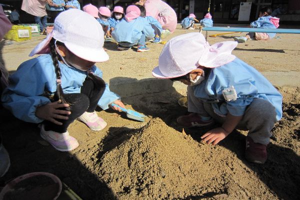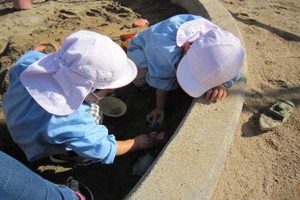 今日も園庭でたくさん遊びました。お友達が遊んでいるところに、他のお友達がやってきて、自然と一緒に遊び始め、楽しく会話をしながら遊ぶ様子も見られるようになりました。手をつないで「あっちに行こう!」と走っていく姿も見られ、お友達との関りも増えてきました。
