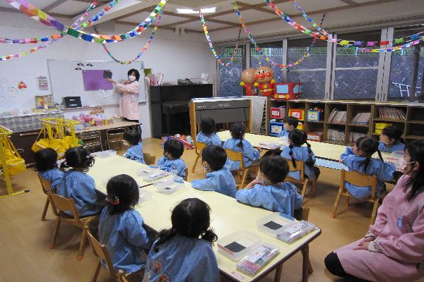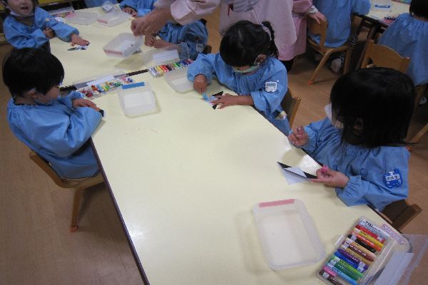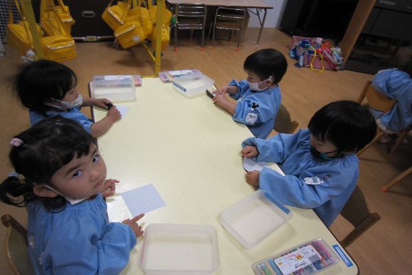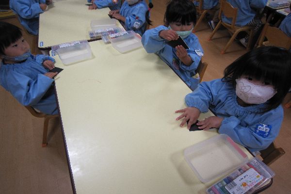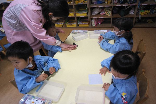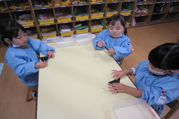 初めて折り紙製作をしました。三角に折って、おにぎりを作りました。角と角を合わせるのが少し難しかったですが、頑張って折っていました。できたおにぎりに、クレパスで好きな具を描きました。梅干しや鮭など、自分の好きな具のおにぎりができました。今度、お弁当を作る予定です。どんなお弁当ができるか楽しみです♪