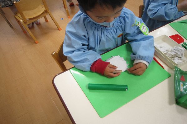 作品展で展示する紙粘土作品の形づくりの練習として、幼稚園の粘土で形を作ってみました。まるいボールを作って潰した後、つまんだり引っ張ったりして上手にかたちを作ることが出来ました。