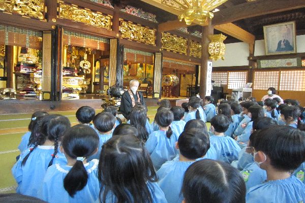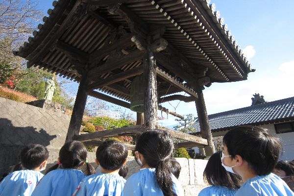 今日はお寺に上がって仏参をしました。園長先生のお話を聞いて年末の除夜の鐘のお話をしていただいて、お寺の金撞き堂を見て帰りました。