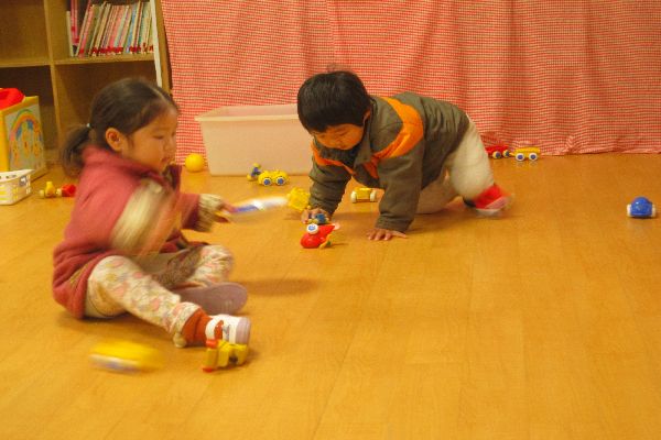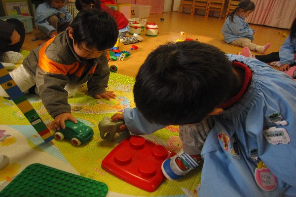 今日は、朝から雪模様!お部屋の中で、ひよこ組さんと遊びました。あたらしいおもちゃがあるので、ひよこ組さんと一緒に仲良くつかいました。
