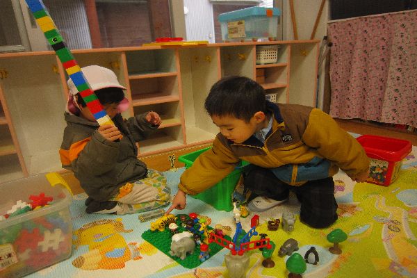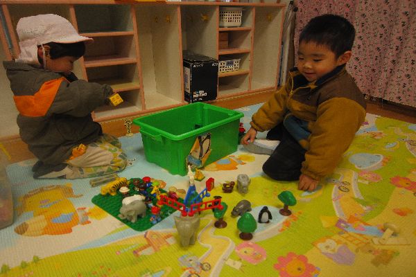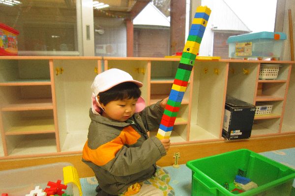 外遊びが終わったら、おやつを食べて、お部屋で遊びました。新しいブロックで動物園をつくりました。いろいろな動物さんを並べたり、エレベーターを作って楽しみました!